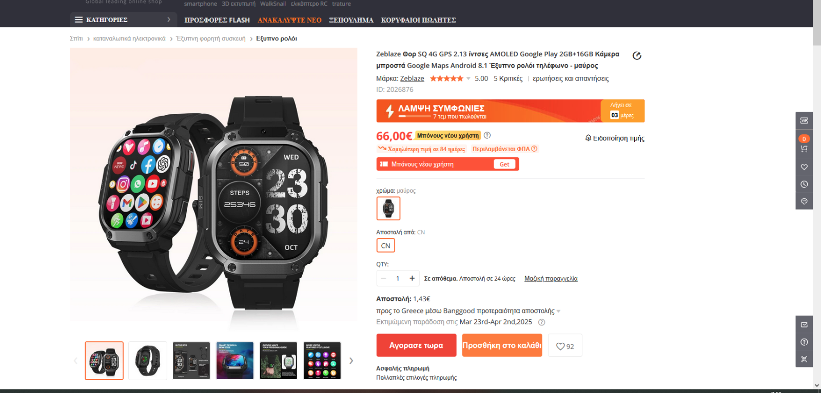 zacharis1955 Δημοσ. 18 Ιουλίου 2024 Δημοσ. 18 Ιουλίου 2024 (επεξεργασμένο) https://www.banggood.com/World-PremiereZeblaze-Thor-SQ-4G-GPS-2_13-inch-AMOLED-Google-Play-2GB+16GB-Front-Camera-Google-Maps-Android-8_1-Smart-Watch-Phone-p-2014979.html 63 € με τον κωδικό BGRJU7ZBL2 και ξετσεκάροντας το εντελώς άχρηστο shipping insurance, αποστολή με Priority Line. https://zeblaze.info/thor-sq.html Επεξ/σία 18 Ιουλίου 2024 από zacharis1955