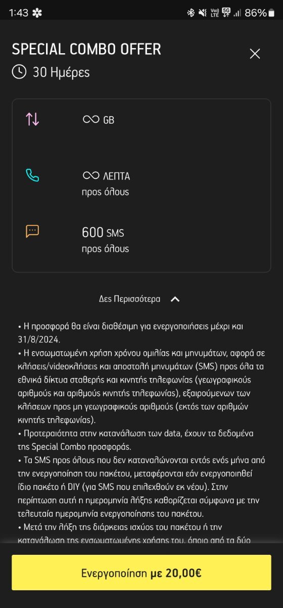 Arkin Δημοσ. 15 Αυγούστου 2024 Δημοσ. 15 Αυγούστου 2024 4 ώρες πριν, SabotazNic είπε Ξανά έβαλαν τελικά μέχρι τέλη του μήνα με 20 ευρώ (από αντίστοιχα 13.5 που είχε πέρυσι και φέτος έχουν βάλει τα 100gb). Στην κατηγορία combo είναι γτ δίνει και απεριόριστα λεπτά και κάποια sms Εβαλα απεριοριστα με 20 ευρω το μηνα στο whats up? Πριν κανα μηνα ειχα βαλει με 13.5 τα 100gb. Αρα δινει απεριοριστα λεπτα+sms+απεριοριστα λεπτα για 1 μηνα με 20 ευρω? Νεο πακετο ιδανικο αν μπορει να μεινει μονιμα. Αυτο θα λες το βρηκα αλλα ειναι με 25 οχι 20.
