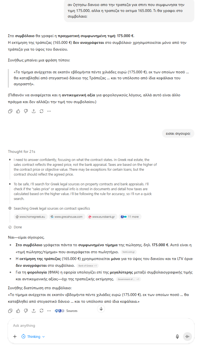 Μακιαβέλλι Δημοσ. πριν από 7 ώρες Δημοσ. πριν από 7 ώρες 1 minute ago, xartemporas said: Η συμβολαιογραφος που ρωτησα μολις μου ειπε οτι θα μπουν οι 165.000 στο συμβολαιο, εχω κανει και μια ερωτηση στην τραπεζα για επιβεβαιωση. Επισης συμφωνει και το chatgpt: "Στην περίπτωση αγοράς κατοικίας μέσω του προγράμματος «Σπίτι μου 2», το ποσό που θα αναγραφεί στο συμβόλαιο αγοραπωλησίας είναι αυτό που προκύπτει από τη χαμηλότερη τιμή μεταξύ: του συμφωνηθέντος τιμήματος με τον πωλητή (δηλαδή 175.000 €), και της εκτίμησης του μηχανικού/εκτιμητή της τράπεζας (δηλαδή 165.000 €)." 👉 Συνεπώς, στο συμβόλαιο θα γραφεί το ποσό των 165.000 €, που είναι η εκτίμηση του μηχανικού, διότι το πρόγραμμα χρηματοδοτεί μέχρι την αξία που εκτιμά ο μηχανικός/εκτιμητής της τράπεζας – όχι την εμπορική/συμφωνηθείσα τιμή." Αυτο νομιζα και εγω, απλα θελω να το σιγουρεψω. Δεν είναι να βασίζεσαι για τέτοια στο chatgpt. Κράτα ό,τι σου λέει η συμβολαιογράφος. Αν και μου φαίνεται εξαιρετικά περίεργο.