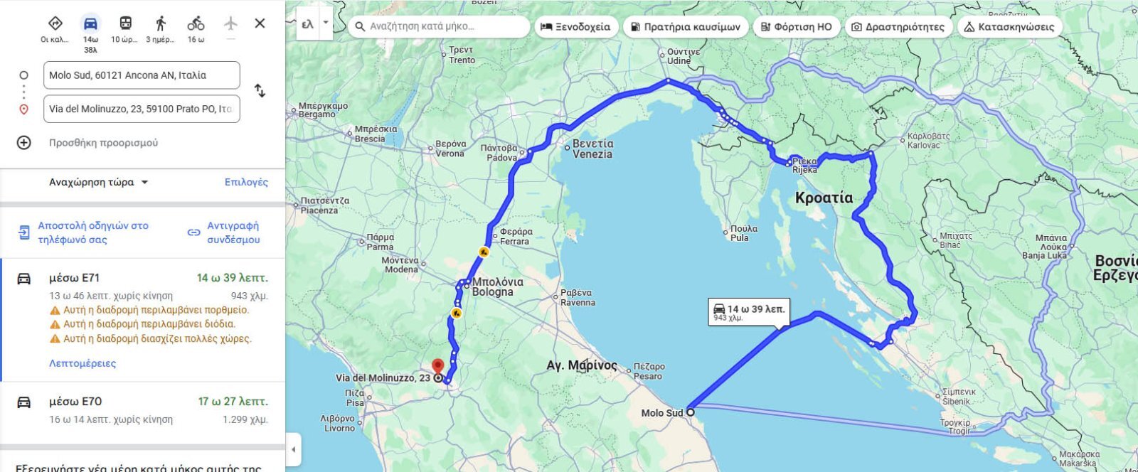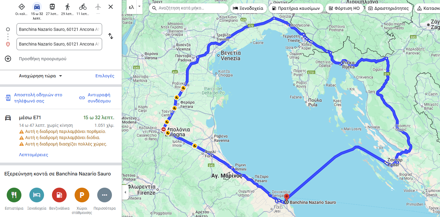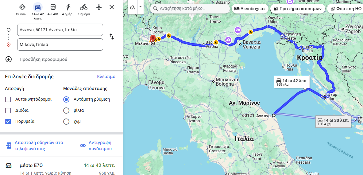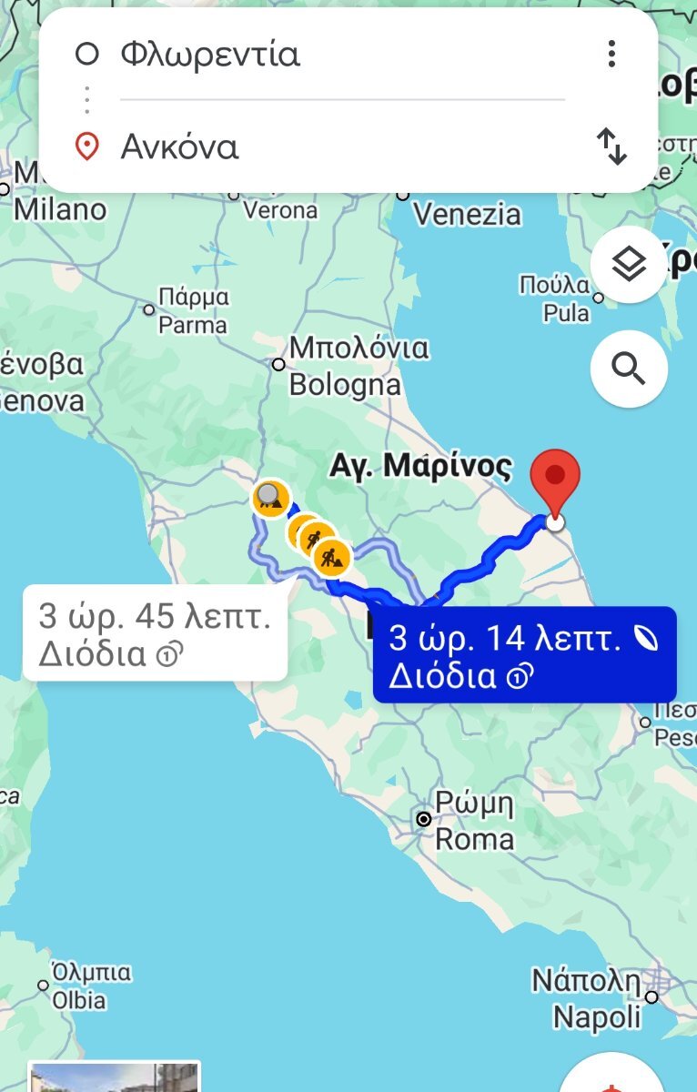 teot Δημοσ. 3 Σεπτεμβρίου 2024 Δημοσ. 3 Σεπτεμβρίου 2024 (επεξεργασμένο) Αν βάλουμε σαν αφετηρία το λιμάνι της Ανκόνας η τον παραλιακό δρόμο της Ανκόνας και προορισμό κάποια πόλη βόρεια....σε πηγαίνει με καράβι μέσω Κροατίας. Ακόμη και την γειτονική Φλωρεντία αν βάλουμε σαν προορισμό σε κάνει μια ωραία βόλτα 14 ωρών μέσω Κροατίας..... Αν η αφετηρία είναι μετά το σημείο που σημειώνω με κόκκινο βέλος η δρομολόγηση γίνεται σωστά Επεξ/σία 3 Σεπτεμβρίου 2024 από teot