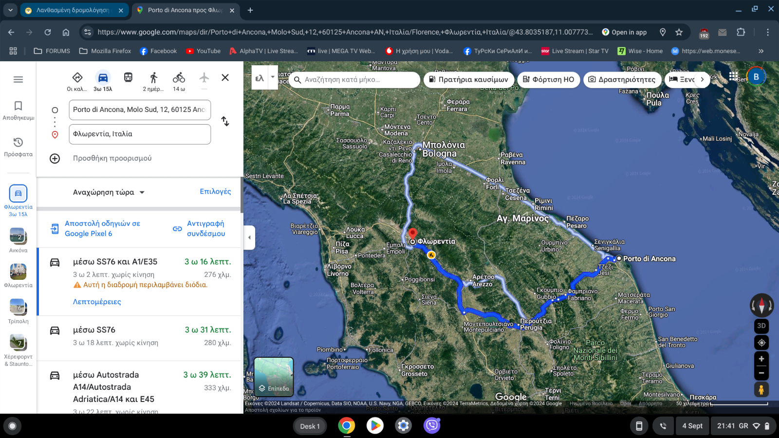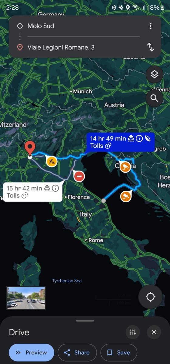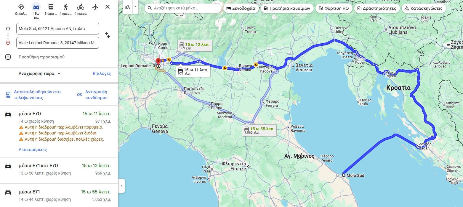 teot Δημοσ. 3 Σεπτεμβρίου 2024 Δημοσ. 3 Σεπτεμβρίου 2024 (επεξεργασμένο) Αν βάλουμε σαν αφετηρία το λιμάνι της Ανκόνας η τον παραλιακό δρόμο της Ανκόνας και προορισμό κάποια πόλη βόρεια....σε πηγαίνει με καράβι μέσω Κροατίας. Ακόμη και την γειτονική Φλωρεντία αν βάλουμε σαν προορισμό σε κάνει μια ωραία βόλτα 14 ωρών μέσω Κροατίας..... Αν η αφετηρία είναι μετά το σημείο που σημειώνω με κόκκινο βέλος η δρομολόγηση γίνεται σωστά Επεξ/σία 3 Σεπτεμβρίου 2024 από teot