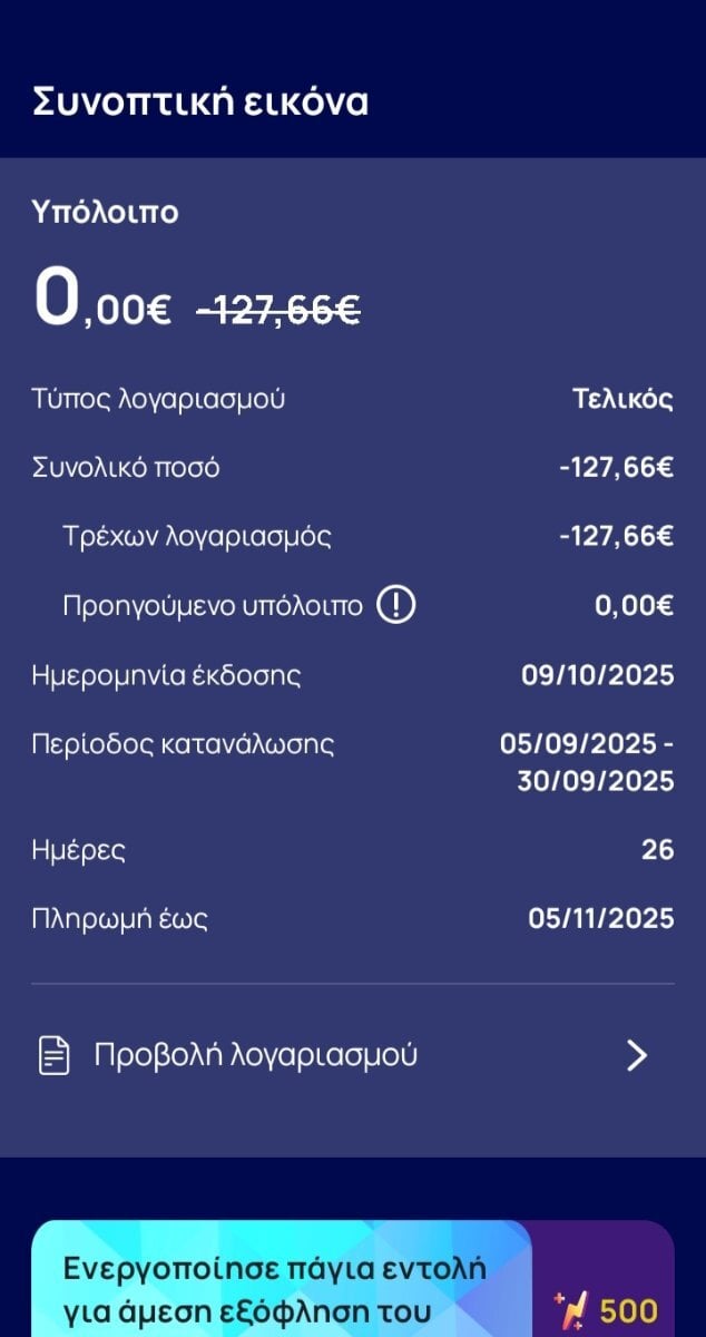 Δεν με αφήνει να ανοίξω να δω τον λογαριασμό αναλυτικά. Όταν θα λάβω μήνυμα λέει θα υπάρξει δυνατότητα.