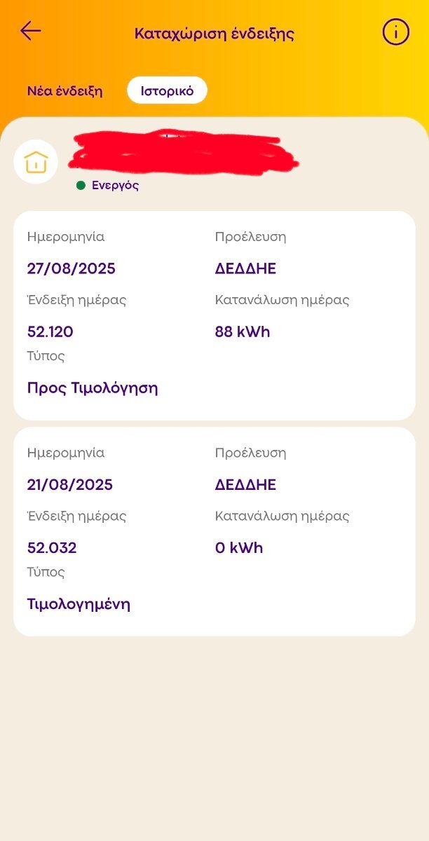 Πάτα εκεί που λέει θέλω να καταχωρήσω ένδειξη, στην επόμενη οθόνη επέλεξε ιστορικό και δες εάν έχεις νέα ένδειξη και σε τι κατάσταση βρίσκεται (προς τιμολόγηση η τιμολογημενη)
