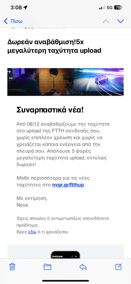 Marios2410 Δημοσ. 15 Νοεμβρίου 2024 Δημοσ. 15 Νοεμβρίου 2024 Καλησπέρα!! Σήμερα έλαβα ένα sms και ένα mail από την nova το οποίο έλεγε ότι θα αναβαθμίσει δωρεάν από 8/12/24 το upload της γραμμής μου. ( έχω FTTH 1gbs) το έλαβε κανένας άλλος;