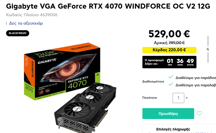 alexx Δημοσ. 18 Νοεμβρίου 2024 Δημοσ. 18 Νοεμβρίου 2024 (επεξεργασμένο) Καλησπέρα η κάρτα του τίτλου στα 529,00 € https://www.plaisio.gr/anavathmisi-diktia/anavathmisi-pc/kartes-grafikon/gigabyte-vga-geforce-rtx-4070-windforce-oc-v2-12g_4639006 Επεξ/σία 19 Νοεμβρίου 2024 από alexx 1 3