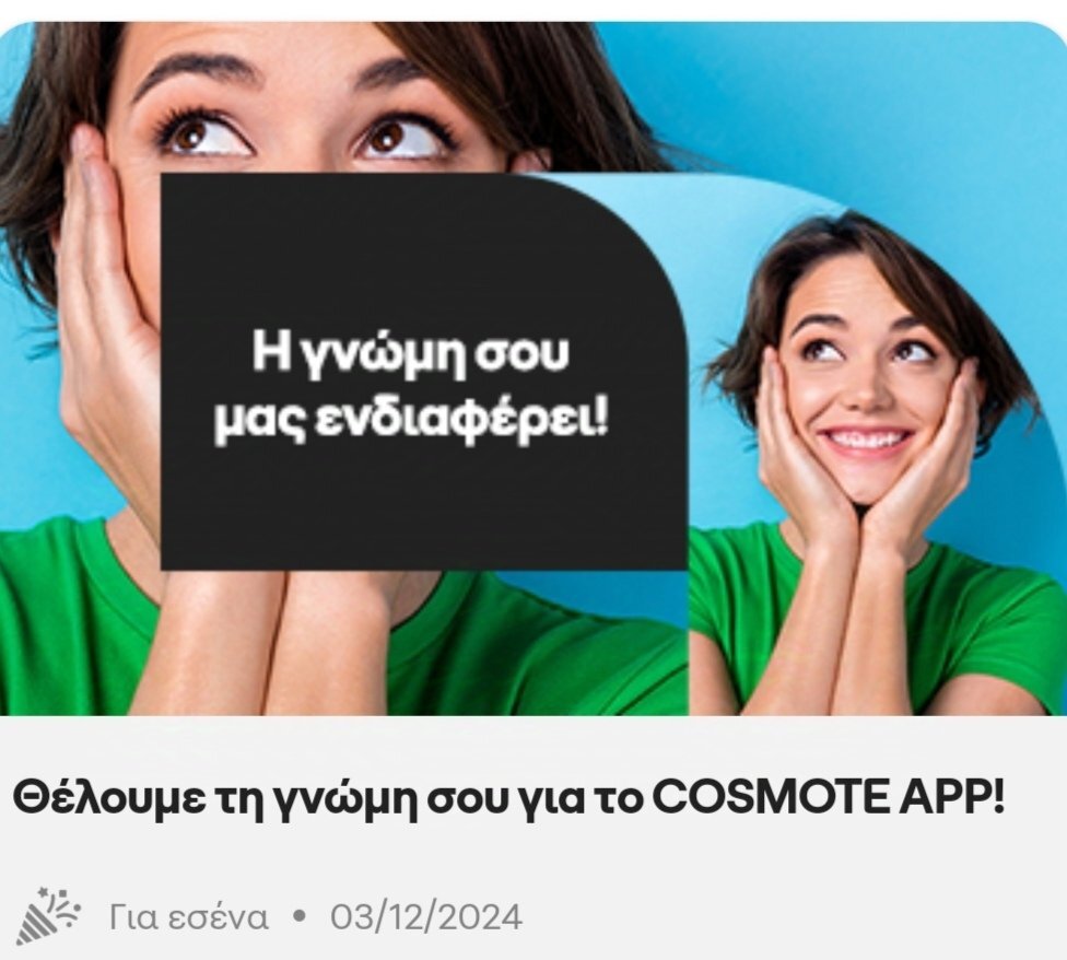 tonis1989 Δημοσ. 3 Δεκεμβρίου 2024 Δημοσ. 3 Δεκεμβρίου 2024 (επεξεργασμένο) 3 Gb για 3 ημέρες δίνει το Cosmote App απαντώντας ερωτηματολόγιο. Υπάρχει στην ενότητα Ανακάλυψε -> Για εσένα. Επεξ/σία 3 Δεκεμβρίου 2024 από tonis1989 5