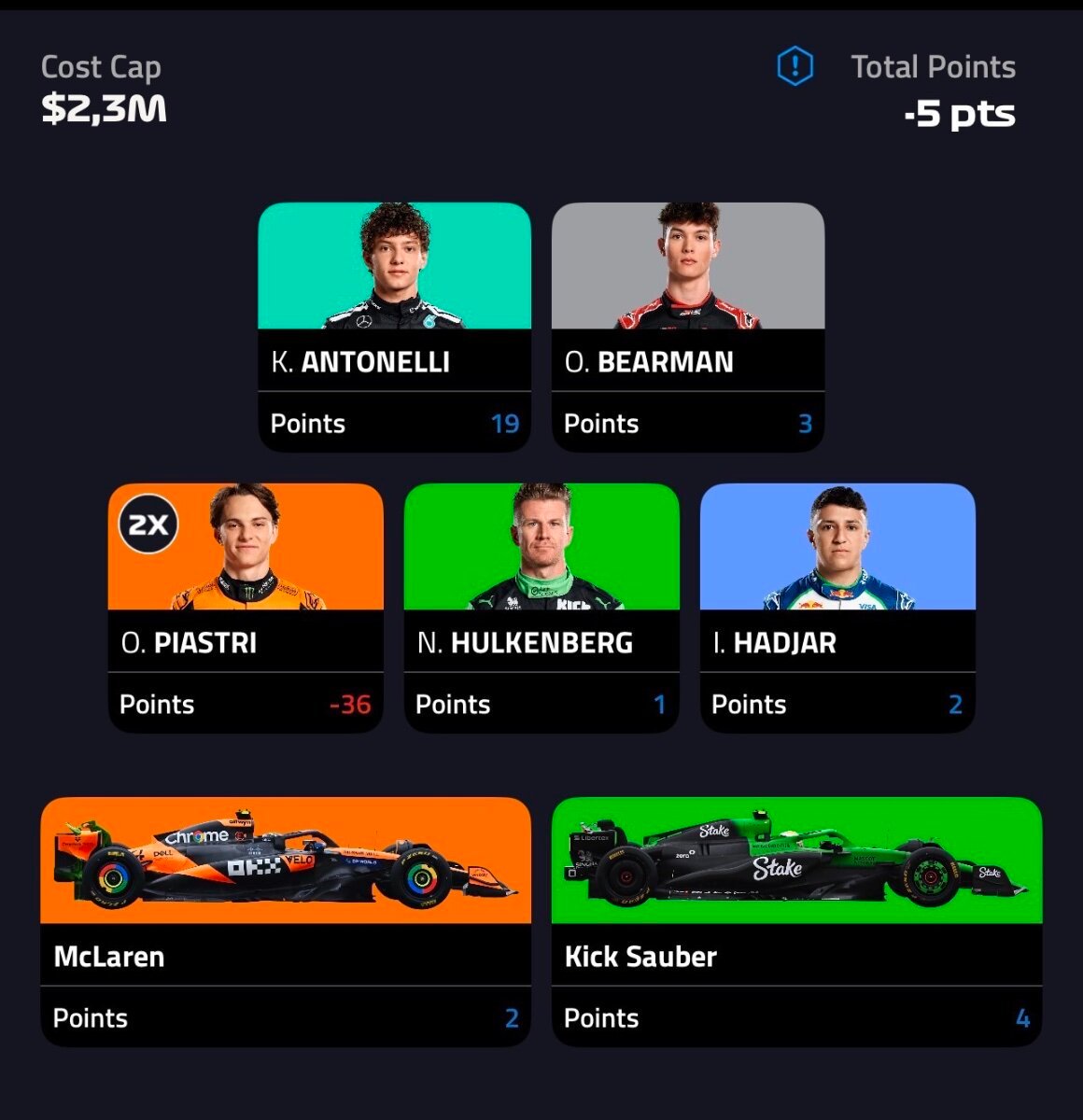 xacto Δημοσ. 21 Σεπτεμβρίου Δημοσ. 21 Σεπτεμβρίου Βλέποντας τον Oscar να κοπανάει τις μπαριέρες, (αφορμής δοθείσης, όλοι ανησυχούν για τον πιλότο και για το μονοθέσιο, κανείς δεν ρωτάει για τις καημένες τις μπαριέρες), ήμουν σίγουρος ότι θα δοθούν εντολές στον Lando. Δεν ήμουν σίγουρος αν θα του έλεγαν να σταματήσει στην άκρη και να πάει να βρει τον Oscar ή να κοπανίσει κάποια μαλακή μπαριέρα για να είναι ακριβοδίκαιο. Τελικά τον καθυστέρησαν στο πιτστοπ για να βγει πίσω από τον Charles. Ημίμετρα! Που λες, έβαλα στο Calc του LibreOffice τα δεδομένα. 7 αγώνες υπολείπονται, οι 3ις με sprint. Όποια ομάδα κάνει το 1-2 σε όλους, παίρνει 346 βαθμούς. Από την Ferrari και πάνω, όλα παίζονται. Όποιος πιλότος τερματίσει πρώτος σε όλους, παίρνει 199 βαθμούς. Από τον Charles και πάνω, παίζουν όλοι. Charles και Ferrari είναι τα σημεία ανατροπής. Τυχαίο; 2