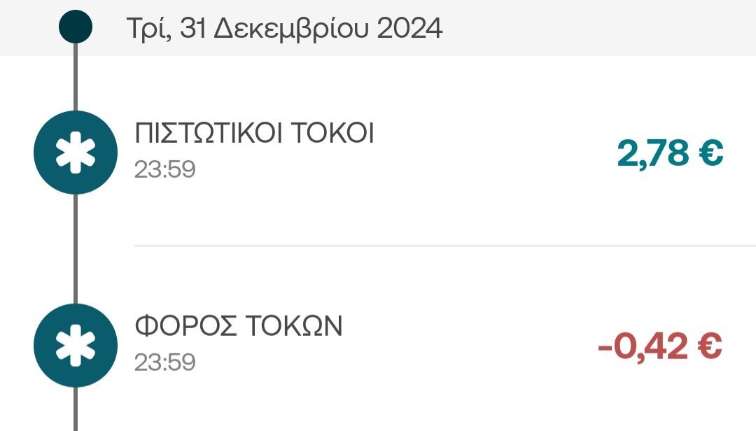 teot Δημοσ. 1 Ιανουαρίου Δημοσ. 1 Ιανουαρίου (επεξεργασμένο) 4 ώρες πριν, geomalliv είπε Καλησπέρα βρε παιδιά καλη χρονιά σε όλους. Θα με τρελάνουν εκει στην Εθνικη η κοπελίτσα μου τα μασαγε και πεταγε ακυρες λέξεις. Είδα στις κινλησεις του λογαριασμού μου χρέωση 0,06€ και 0,10€ για 2 λογαριασμούς ταμιευτηρίου που έχω. Έχουν αιτιολογία "Χρεωστικοί τόκοι". Και γίνανε 31/12 στις 23,59,59 Έχετε καθόλου εικόνα τι είναι αυτό; η κοπελιτσα μου πεταγε κατι valure σαν λέξη και μετα ό,τι και να έλεγα ελεγε να διαβάσω το προσυμφωνητικο 3 ώρες πριν, stathisp είπε Κι εμένα το ίδιο (0,02€). Δεν το έψαξα αλλά μου έκανε πολύ αρνητική εντύπωση. Καλή Χρονιά Καποια στιγμή έκανες ανάληψη σε ποσό που δεν ήταν ακόμη διαθέσιμο (πχ μισθοδοσία που μπαίνει το απόγευμα αλλά είναι διαθέσιμη απο την άλλη ημέρα) και χρεώθηκες με αρνητικούς τόκους.... είναι σαν να δανείστηκες απο την τράπεζα. Για να γίνει πιο κατανοητό.... Αυτή είναι μια μεταφορά που μου έγινε σήμερα (1/1/2025), είναι απο την Πειραιώς αλλα το ίδιο ισχύει για όλες τις τράπεζες.... προσοχή λεει αυριανή ημερομηνία (2/1/2025, την πρώτη εργάσιμη)… Αν κάνω ανάληψη και στον λογαριασμό μου δεν επαρκούν τα χρήματα που υπήρχαν πριν αυτή την μεταφορά που μου έγινε σήμερα, θα χρησιμοποιήσει και χρήματα απο την συγκεκριμένη μεταφορά … αλλά επειδή δεν είναι ακομη δικά μου (ετσι λεει η τράπεζα) θα χρεωθώ με αρνητικούς τόκους που αντιστοιχούν στο ποσό που λείπει. Οι αρνητικοί (χρεωστικοί) τόκοι εκκαθαρίζονται και τους βλέπεις στις τοκοφόρες ημερομηνίες (συνήθως κάθε εξάμηνο) και όχι όταν γίνεται η συναλλαγή Καμιά σχέση με φορο τόκων που αναφέρουν.... εκει γραφει "φορός τόκων" και όχι "Χρεωστικοί τόκοι" που είναι η δικιά σου ένδειξη. Επεξ/σία 1 Ιανουαρίου από teot 1