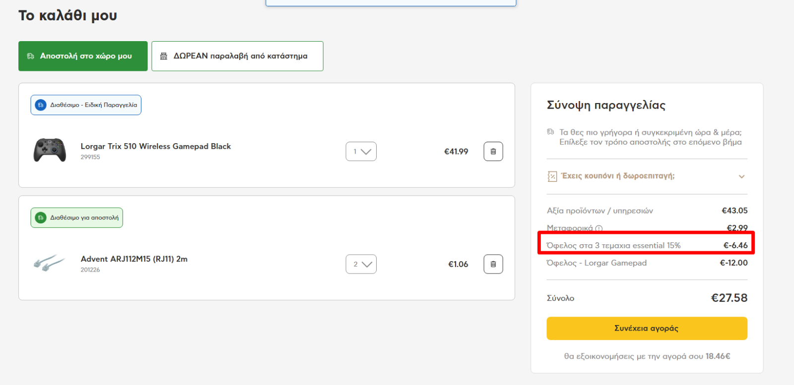 Billator Δημοσ. 1 Φεβρουαρίου Δημοσ. 1 Φεβρουαρίου (επεξεργασμένο) Αν προσθέσεις 3 προιόντα (λογικά περιφεριακά μόνο) και πάνω έχεις ένα επιπλέον 15% έκπτωση. Οπότε πέφτει στα 27,58 βάζοντας κάτι αρκετά φθηνό. πχ Επεξ/σία 1 Φεβρουαρίου από Billator 3