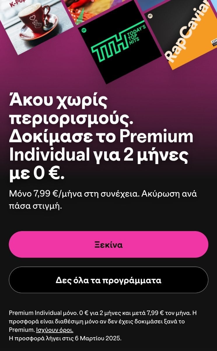 tonis1989 Δημοσ. 13 Φεβρουαρίου Δημοσ. 13 Φεβρουαρίου Premium Individual μόνο. 0 € για 2 μήνες και μετά 7,99 € τον μήνα. Η προσφορά είναι διαθέσιμη μόνο αν δεν έχεις δοκιμάσει ξανά το Premium. https://www.spotify.com/gr/premium/ Η προσφορά λήγει στις 6 Μαρτίου 2025 Όροι: https://www.spotify.com/gr/legal/premium-promotional-offer-terms/