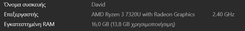 Mimoupeis Δημοσ. 10 Μαρτίου Μέλος Δημοσ. 10 Μαρτίου 13 λεπτά πριν, Kthulhou είπε ειναι shared με την GPU, δηλ η μνήμη που "λείπει" , χρησιμεύει στην κάρτα γραφικών https://www.skroutz.gr/s/48002746/Lenovo-V15-G4-AMN-15-6-FHD-Ryzen-3-7320U-16GB-512GB-SSD-W11-Pro-Business-Black-GR-Keyboard.html#specs Ευχαριστω 1