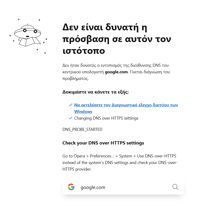 alex89 Δημοσ. 27 Μαρτίου Δημοσ. 27 Μαρτίου Καλησπέρα, Μετά από ένα windows update παρατήρησα πως δε λειτουργεί το google search. To screen shot είναι από τον opera, αλλά το ίδιο συμβαίνει και με τον chrome και τον firefox. Όλες οι ιστοσελίδες λειτουργούν κανονικά εκτός της google. Γνωρίζετε αν υπάρχει κάποιο πρόβλημα με την google ή με την τελευταία αναβάθμιση σε Win 10; Ευχαριστώ.