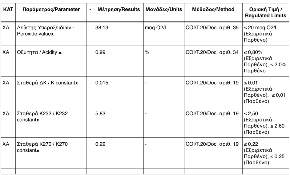 GREGORYMO Δημοσ. 10 Απριλίου Δημοσ. 10 Απριλίου 23 ώρες πριν, nickarg19 είπε Καλησπέρα σε όλους, Είναι η πρώτη φορά που γράφω στο φόρουμ, ελπίζω να βρεθεί κάποιος σχετικός να με κατατοπίσει. Έδωσα πρόσφατα σε ένα εργαστήριο ένα δείγμα για ανάλυση ελαιόλαδου που μου είχε δοθεί από συγγενικό μου πρόσωπο. Ήταν εμφανές ότι δεν ήταν ποιότητας βέβαια και εν συνεχεία πήρα τα εξής αποτελέσματα που φαίνονται στην εικόνα. Συνοπτικά από το εργαστήριο μου απάντησαν ότι είναι ακατάλληλο για κατανάλωση (γενικά). Διάβασα μερικά πράγματα για το τι σημαίνει ο κάθε δείκτης στο ίντερνετ αλλά ήθελα κάποιος σχετικός (αν ασχολείται με τρόφιμα ακόμα καλύτερα...) να με κατατοπίσει καλύτερα και πιο πρακτικά. Με βάση την εικόνα τί συμπέρασμα βγάζουμε ότι απλά δεν είναι φετινό; ότι έχει γίνει πρόσμειξη με άλλα έλαια; (αυτό κυρίως θα ήθελα να μου απαντήσει κάποιος αν προκύπτει!) ή ότι δεν έχει συντηρηθεί σωστά; Ευχαριστώ πολύ τον όποιο γνώστη! Το εργαστήριο τι λέει?