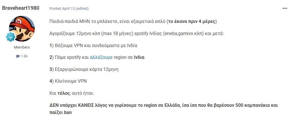 stark Δημοσ. πριν από 1 ώρα Δημοσ. πριν από 1 ώρα 1 hour ago, duckino said: Βρε αυτό το ήξερα.Έτσι θα το έκανα. Άρα στην ουσία κάνω την ίδια διαδικασία αλλά δεν ξανά αλλάζω για κανένα λόγο το region σε Ελλάδα.Αυτή είναι η μόνη διαφορά στη διαδικασία που θα έκανα ένα μήνα πριν. Το VPN χρειάζεται να το έχω Ινδία όταν παίζει το Spotify; Με τα παλιά δεδομένα όχι. Εγώ 3 χρόνια τόσο με family όσο και με ατομικό ινδικό δεν έπαιζα με VPN ανοικτό. Το τι θα γινει τώρα με τους νεους όρους δεν το ξέρουμε ακόμα. Υπάρχει η υπόνοια ότι θα γίνουν πιο αυστηροί οι έλεγχοι στο θέμα του location (geolocation ή / και ip location). Παίζει, βέβαια, να μη γίνει και τίποτα...
