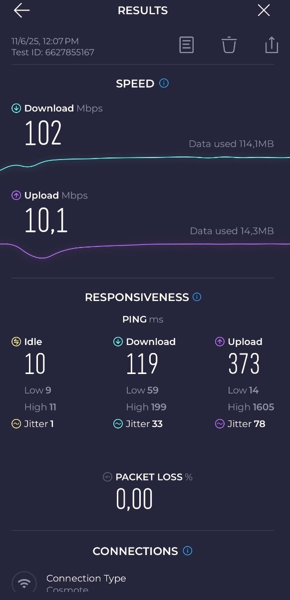 petros002 Δημοσ. 14 Ιουνίου Μέλος Δημοσ. 14 Ιουνίου 1 ώρα πριν, jimakos00 είπε από το κινητό έχεις 10 ms ping ; να το τεστ έγινε από το κινητό την ημέρα της εγκατάστασης που ήταν παρόν και ο τεχνικός και όταν του το έδειξα μου είπε ότι το ping είναι υψηλό αλλά αφού κάνει το ΟΝΤ ενημέρωση μέσα σε μια μέρα θα πέσει στο 4-5