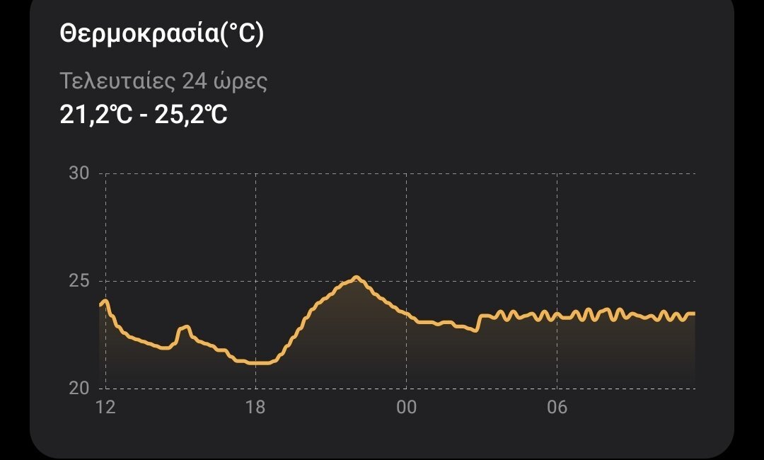 GiannisSol Δημοσ. 9 Νοεμβρίου 2024 Δημοσ. 9 Νοεμβρίου 2024 Λειτουργία θέρμανσης στο Gree Airy 18. Βλέπετε το γράφημα με τα watt που κάνει διακοπτόμενη λειτουργία από τα 650 watt. Παρόλα αυτά διατηρεί μια μέση ωριαία κατανάλωση 260 watt. Έξωτερικη 11 ζητούμενη 24. Στο άλλο γράφημα φενεται η συμπεριφορά της θερμοκρασίας στο χώρο από το ακριβές tapo T315. Το πριόνι που βλέπετε είναι αποκλειστικά η χρήση του κλιματιστικού , το εύρος του πριονιου είναι 23.3 έως 23.7. Λογικά αυτη η διακύμανση στη θερμοκρασία δεν θα υπήρχε αν δούλευε συνεχόμενα χαμηλά όπως το Fujitsu. Έχουμε κάποιο γράφημα με τη θερμοκρασία χώρου στο Fujitsu?
