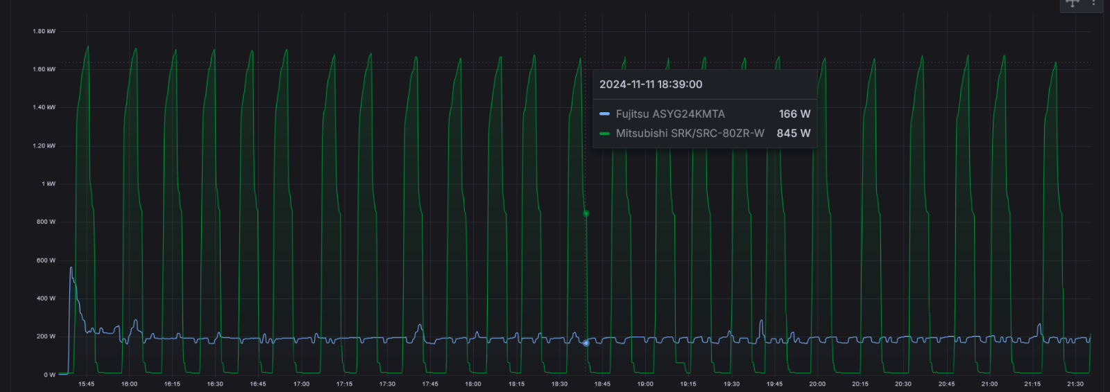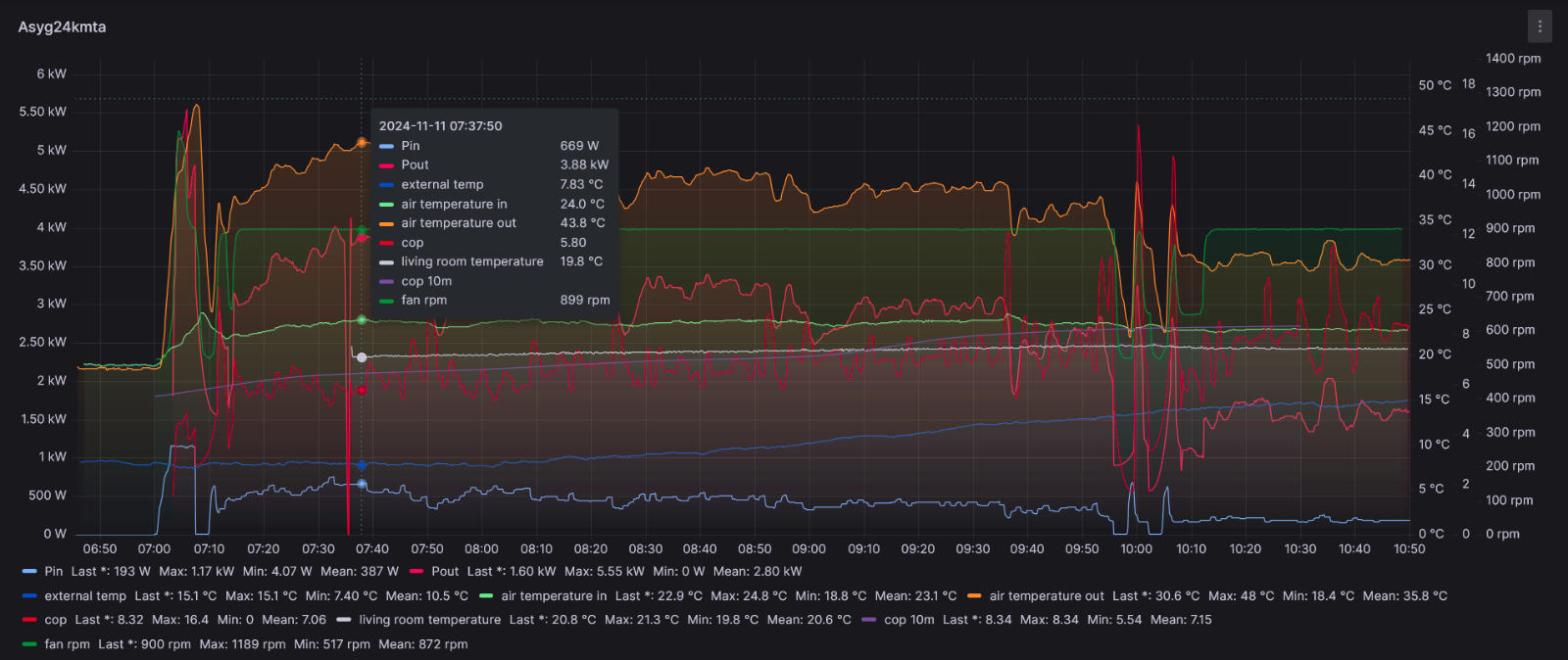Ison_ Δημοσ. 11 Νοεμβρίου 2024 Δημοσ. 11 Νοεμβρίου 2024 8 λεπτά πριν, liakjim είπε Σε μερικά φαίνονται, σε άλλα όχι, αλλού και να φαίνονται ο χρήστης δεν τα βλέπει ποτέ των ποτών, οπότε δυστυχώς δεν υπάρχει κάποιος καλός μπούσουλας. Λίγο specs, λίγο service manual, λίγο eurovent, λίγο forum . Κάπου εκεί μέσα συνήθως βγαίνει άκρη. Για μένα η πιο καλή ένδειξη είναι το ενεργειακό ταμπελάκι. Όσο μικρότερο το pdesign στο θερμό scop , τόσο αυξάνουν οι πιθανότητες το κλιματιστικό να έχει χαμηλά ελάχιστα. Στα δικά μας, έπεσε αρκετά η θερμοκρασία σε σχέση με τις προηγούμενες ημέρες, λίγο πιο κάτω από 8C. Ορίστε ένα διάγραμμα από το asyg24kmta. Αν κάνετε hover το ποντίκι, θα δείτε τιμές κατανάλωσης, θερμοκρασιών αέρα στα φίλτρα και στην περσίδα, θερμοκρασία χώρου και εξωτερική, στροφές ανεμιστήρα, προσδιδόμενη ισχύς στον χώρο, στιγμιαίο cop και μέσο cop στο 10λεπτο. Αν μαρκάρετε μια περιοχή, μπορείτε να κάνετε και ζουμ. κλικ εδώ -> https://snapshots.raintank.io/dashboard/snapshot/Ur4nPO8JJwmOD4HfRJkfbfdHTIw5v6ut και θα βγει κάτι τέτοιο -> Το pdesign είναι τα «kW» πάνω ακριβώς από το SCOP σε ένα ενεργειακό ταμπελάκι;