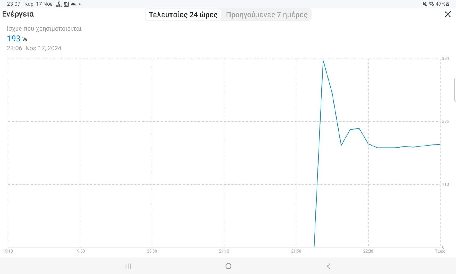 cmaniac Δημοσ. 17 Νοεμβρίου 2024 Δημοσ. 17 Νοεμβρίου 2024 Αφού σας αρέσουν τα γραφήματα, ας βάλω κι εγώ ένα. Πλέον οι θερμοκρασίες μου κάνουν τη χάρη, άρχισα να ψάχνομαι. 20:43, αλλάζω από 3D Auto σε "καρφωτές" περσίδες. Αμέσως κρεμάει και αρχίζει τα on-off. 21:02, ξαναβάζω 3D Auto, κάνει τον κύκλο και ισορροπεί στα 140W. 21:14, αλλάζω το set temp από 24 σε 24.5. Ανεβάζει 300-400W και μετά πέφτει στα 200-250W. .. και τελικά καταλήξαμε στις μικροδιορθώσεις 160-230W. Τελικά το 3D Auto (αυτόματη ρύθμιση περσίδων) για κάποιο λόγο όντως το κάνει πιο "μαλακό" στον έλεγχο.. 46 λεπτά πριν, Lofarek είπε Δουλεύει πιο στρωτά τώρα που έπεσε η εξωτερική θερμοκρασια Τα στήνουμε; 😁 1 2