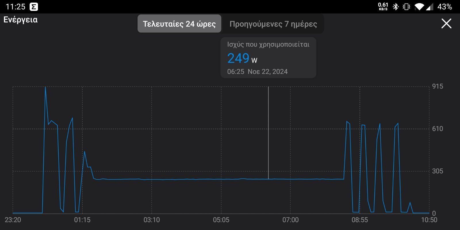 GiannisSol Δημοσ. 22 Νοεμβρίου 2024 Δημοσ. 22 Νοεμβρίου 2024 (επεξεργασμένο) @liakjim χθεσινή λειτουργία του 18ριου Gree αυτή τη φορά χωρίς sleep mode. Έπεσε πάλι στα 250watt σερί μέχρι το πρωί που το έσπασε . Θερμοκρασία εξωτερική στη 1.30 που ξεκίνησε το χαμήλωμα 14 βαθμοί και στις 8.30 που το διέκοψε 12.9 βαθμοί. Ζητούμενη πάντα 24 με autofan Άρα δεν ήταν το sleep mode που ρίχνει τα watt χαμηλά. Και δεν μπορώ να καταλάβω τις θερμοκρασίες που το κάνει . Επεξ/σία 22 Νοεμβρίου 2024 από GiannisSol 1