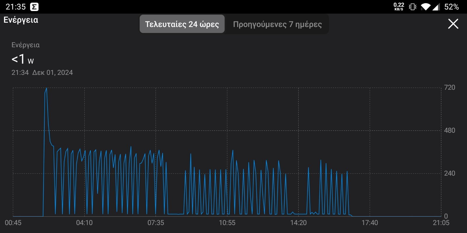 GiannisSol Δημοσ. 1 Δεκεμβρίου 2024 Δημοσ. 1 Δεκεμβρίου 2024 Μόλις τώρα, stelikov είπε Ειναι απλά απαράδεκτο. Αυτά τα ελάχιστα βατ ειναι για κινέζικα των 300 ευρώ. Τωρα αν το ON/OFF δεν ειναι ενοχλητικο μια χαρά. Όχι ευτυχώς δεν κάνει αισθητή τη παρουσία του σε μέσα-εξω μονάδες. Ούτε τριξιματα. Από τη θέση των περσίδων και το λαμπάκι επάνω του καταλαβαίνω ότι λειτουργεί. Όταν βλέπω το γράφημα της tapo νευριάζω μόνο. 28 λεπτά πριν, Klausx είπε Στα σωστά κλιματιστικά τα on/off είναι θέμα ρύθμισης του χρήστη ή μερικές φορές του εξειδικευμένου τεχνικού που θα πρέπει να αντιληφθεί ότι θέλει μεγαλύτερο diff κτλ. Και το Fujitsu 09KGTG αν το ξεκινήσω ξαφνικά με θερμοκρασία δωματίου 19C και set point 22C θα κάνει άπειρα on/off, γιαυτό όπου είναι κύρια πηγή θέρμανσης προτείνεται η 24ωρη λειτουργία, ειδικά στα 18,000 btu και πάνω. Μέχρι να το προγραμματίσω απλά το ξεκινάω (cold start) με set point 25C και μια χαρά φτάνει στα ελάχιστα watt χωρίς να κάνει on/off. Μπορεί μερικές φορές να χρειαστεί -0.5 για να φτάσει τα ελάχιστα αλλά αν το κάνω από 25->24 αρχίζει πάλι τα on/off όπως βλέπετε και στο διάγραμμα στα πειράματα που έκανα. Όποιο On/off έχει διάρκεια μόνο 3-5 λεπτά(ελάχιστη προστασία συμπιεστή) σημαίνει ότι κάτι πάει λάθος στις ρυθμίσεις. Με τo ΜΕ έχω πειραματιστεί , δεν το σταθεροποιω πουθενά .Με πολλές απώλειες μόνο το σταθεροποιω ψηλά με τίμημα τη κατανάλωση.