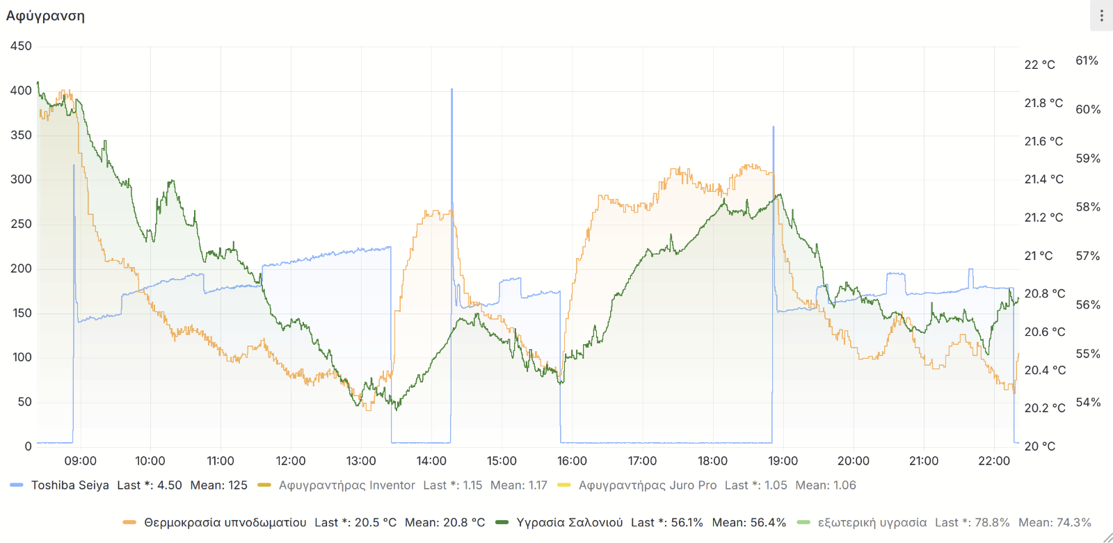 Στις δοκιμές που έχω κάνει και έχω ανεβάσει λεπτομερη διαγράμματα λίγο πριν οι μεσόπορτες είναι ανοιχτές και η υγρασία κατέβαινε στο σαλόνι σημαντικά. Ζητούμενη έβαλα 21 γιατί με 26 προφανώς δεν γίνεται αφύγρανση. Το Edge πιθανότατα κάνει On/OFF με αυτήν την ζητούμενη και πετάει ξανά την υγρασία που απορρόφησε στον χώρο.