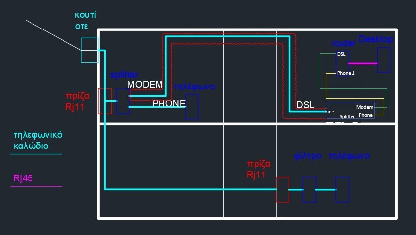 jkoukos Δημοσ. 21 Αυγούστου Δημοσ. 21 Αυγούστου Στο σχέδιο δείχνεις ότι έχεις Modem συνδεδεμένο στην τηλεφωνική γραμμή και μετά τον Router πάλι στην τηλεφωνική γραμμή. Αυτό απλά είναι αδύνατον. Το Modem κάνει τον συγχρονισμό σε DSL (άρα μόνον αυτό συνδέεται στην γραμμή) και ο Router την κλήση ΡΡΡοΡ (και κατ' επέκταση την σύνδεση με το διαδίκτυο), ΑΛΛΑ μεταξύ τους αυτά τα 2 συνδέονται με καλώδιο δικτύου και όχι τηλεφωνικό. Τι ακριβώς ισχύει; Το σχέδιο της Cyta κάνει για την δική σου περίπτωση, εφόσον ισχύει το τελευταίο δικό σου σχέδιο και όντως υπάρχει Modem. Γράψε τα μοντέλα του Modem και του Router που έχεις για να καταλάβουμε τι συσκευές είναι και να σου προτείνουμε τι μπορεί να γίνει. Και κάτι τελευταίο. Η καλωδίωση μεταξύ των 2 πριζών από το Modem έως τον Router, πόσα εσωτερικά ζεύγη έχει και πόσα είναι συνδεδεμένα πίσω από αυτές τις πρίζες;
