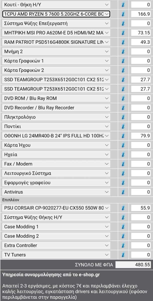 dpolal Δημοσ. 26 Αυγούστου Δημοσ. 26 Αυγούστου 9 ώρες πριν, sattack είπε Εδώ πάμε λίγο ανάποδα από ότι συστήνουμε συνηθως, γιατί δεν υπάρχει ζήτημα επιδόσεων, αλλα σταθερού VFM. Μια πρόταση για βάση συζήτησης, από το eshop επειδή έχει εύκολο configurator και κάνει και τη συναρμολόγηση. - Cpu 7600 που έχει και ενσωματωμένα γραφικά. Βοx με εργοστασιακή ψυκτρα. - μητρική την πιο φθηνή mATX σοβαρής μάρκας γιατί δεν χρειάζεται τίποτα παραπανω. - μνήμες το πιο φθηνό ζευγαρι 2x 8GB, κι ας είναι 4800 cl40, γιατί ούτε περισσότερη χωρητικοτητα χρειάζεται, ούτε φυσικά θα τρέχουν σε overclock! Σε 4800 θα τρέχουν συνεχώς. - Για ssd, η σκέψη μου είναι 2 sata3 δίσκους, για να τους βάλεις σε raid1 ώστε να εχεις μόνιμο backup (αν χαλάσει ο ένας, κάνεις rebuild απο τον 2ο). Φυσικά που και που παίρνεις και εξωτερικό backup. Νομίζω 512GB θα φτάνουν για το πρόγραμμα φαρμακείου. Αν χρειάζεσαι μεγαλύτερους, φυσικά υπάρχουν. Kαι sata3. Δεν υπάρχει κανένας λόγος να πάρεις NVMe. Πολύ μεγαλύτερο μπλέξιμο θα ήταν οι NVMe. Mε τους sata3, θα τους εχεις εύκολα προσβάσιμους, να αντικαταστήσεις κάποιον αν χαλάσει, ή και εύκολα να τον βγάλεις και να τον πας κάπου αλλού, σε άλλο pc για οποιοδήποτε λογο μπορεί να χρειαστεί (ανάκτηση δεδομένων ή ξέρω γω τι). - PSU ενα σοβαρής μάρκας, Corsair. - μια οθόνη 24" σοβαρής μάρκας LG, 100Hz, δεν χρειάζεται κατι αλλο. - και συμπληρώνεις ένα κουτί, που να σε βολεύει και ένα απλό πληκτρολόγιο/ποντίκι. Οποτε το πνεύμα της σύνθεσης ειναι: ένα σοβαρό οικονομικο ΑΜ5, που είναι πολύ χαμηλών θερμοκρασιών, και που αν οτιδήποτε χαλάσει βρίσκεις αμμεσως εξαρτηματα, που δεν θα τρεχει καθόλου overclock, και νομίζω το βασικότερο σε εσένα που παει κόντρα στο πνεύμα της εποχής, 2 ssd sata3 σε raid1, γιατί η έμφαση είναι στο uptime και στο να μην χάσεις δεδομένα, ούτε χρόνο, ούτε τίποτα, αν τυχόν χαλάσει ο ενας ssd. (Θεωρητικα, επειδη κάηκες στο χυλό μια φορά, θα μπορούσες να παρεις για raid1 και 3 τέτοιους ssd, να μην πω και 4, τοσο φτηνοι που ειναι!) ΥΓ. Μόνο δεν ξέρω στα σίγουρα αν η μητρική υποστηρίζει wake on lan. Aν τυχόν δεν, τότε οποιαδήποτε άλλη mATX που το υποστηρίζει. @bele Από τη στιγμή που μιλάμε για επαγγελματικό χώρο τότε πρέπει απαραίτητα στο ποσό να συμπεριλάβεις ΚΑΙ την αγορά λειτουργικού συστήματος και πιθανών εφαρμογής γραφείου αν θέλεις να έχεις το κεφάλι σου ήσυχο σε τυχόν έλεγχο καθώς και καλού antivirus οπότε το μπάτζετ σου πρέπει να ανέβει. Πριν από κάνα 2χρονο πελάτης μου με φαρμακείο έφαγε ransonware που του κλείδωσε τη βάση δεδομένων της εφαρμογής που χρησιμοποιούσε καθώς και όλα τα backup της που βρήκε στο δίκτυο των υπολογιστών του καταστήματος του.