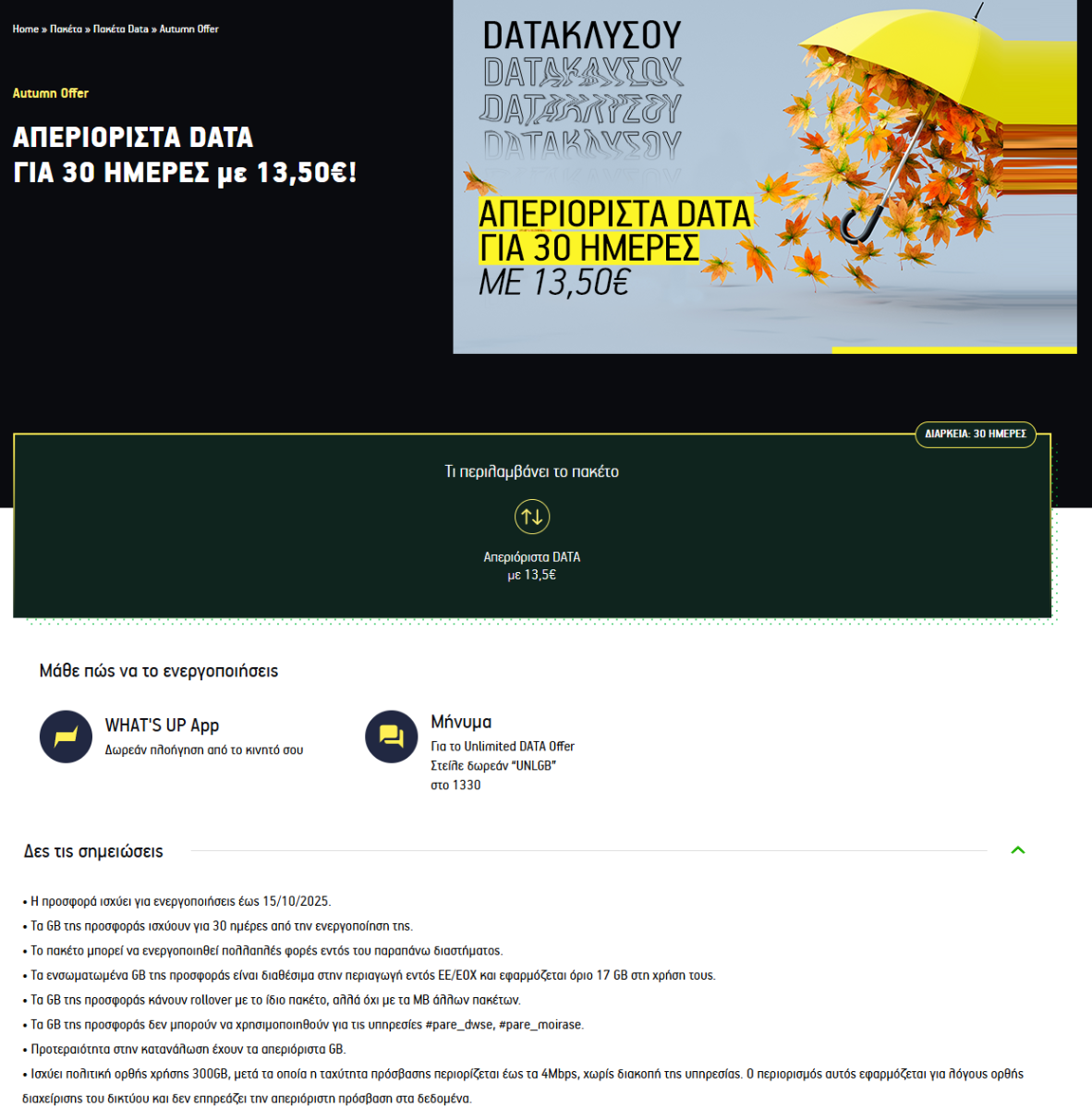 gkat2829 Δημοσ. πριν από 22 ώρες Δημοσ. πριν από 22 ώρες 40 λεπτά πριν, dream21 είπε https://www.whatsup.gr/paketa/paketa-data/autumn-offer-2025 Αυτο το πακετο που εχεις ανεβασει δεν αφορα την συγκεκριμενη προσφορα του τιτλου αν εχεις δει. Αυτη η προσφορα υπαρχει απο τον Ιουνιο και εχει αναφερθει οτι εχει κοφτη στα 300GB πολλες φορες. 2