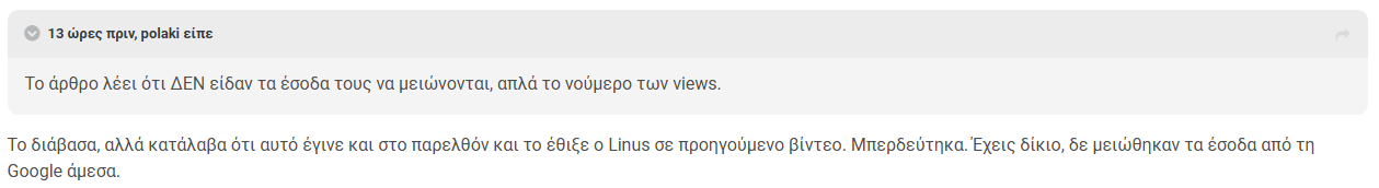 Tlykog Δημοσ. 30 Σεπτεμβρίου Δημοσ. 30 Σεπτεμβρίου (επεξεργασμένο) 11 ώρες πριν, interkirilos είπε Ειρωνεύτηκες το μέγεθος της οθόνης ουσιαστικά βγάζοντας την αχρείαστη, δίνοντας σαν παράδειγμα το gaming. Σου απέδειξα ότι κανείς λάθος καθώς μπορείς να έχεις πολλά και διαφορετικά ήδη gaming που κάνουν πολύτιμη αυτή την οθόνη, πέρα απ' όλες τις άλλες χρήσεις. Τα άλλα που μου λες είναι ιστορίες για άγριους. Δεν ξέρω τι σου έχει συμβεί και δίνεις τέτοιες απαντήσεις. Ελπίζω να το λύσεις κάποια στιγμή. Πού το έγραψα αυτό; Κάνε μου μια παραπομπή. Μάλλον με μπερδεύεις με άλλον. Δεν απέδειξες κάτι. Αρχικά γιατί δεν έθεσα ποτέ θέμα μεγέθους οθόνης και δεύτερον γιατί δεν έφερες κάποιο επιχείρημα πέρα από τη προσωπική σου χρήση. Το οποίο είναι υποκειμενικό εξαρχής. Τα όσα γράφεις εσύ μοιάζουν εκτός θέματος. Δε διάβασες τί έγραψα ή δεν τα καταλαβες ή με μπερδεψες με άλλον. Δε μπορώ να το εξηγήσω αλλιώς. Πρέπει να το λύσεις πρώτα αυτό και μετά να λύσουμε μαζί ότι θέματα άλλα θέλεις. Ελπίζω αυτό με τα "προσωπικά μου θέματα", δηλαδή φωτογραφίες από βλάβες, αναφορά σε αξιόπιστα sites, στο ίδιο το manual της Samsung να μην το θεωρείς επιχείρημα δικό σου ή ότι σου δίνει κάποιο πλεονέκτημε σε κα΄ποιο διάλογο. Οι προσωπικοί υπενιγμοί είναι ξεκάθαρη έλλειψη επιχειρημάτων. Ειδικά αν δει κανείς και το υπόλοιπο κείμενο σου, που όντως δεν περιέχει κάποιο αντεπειχέιρημα σε αυτά που έγραψα, επιβεβαιώνεται. Χρόνια στα forums έχω ανοσία στο ad hominem. Μόνο επιχειρήματα. Οι προσωπικές επιθέσεις με αφήνουν παγερά αδιάφορο. Αν έχεις κάτι ουσιαστικό να αντικρούσεις στα στοιχεία που έφερα, φέρ’ το. Σε αυτά που γράφω εγώ, όχι εσύ και τα φορτώνεις σε μένα. Διάβασε πρώτα τα μηνύματά μου, ώστε να παραμείενεις εντός θέματος. Διαφορετικά, οι προσωπικές αιχμές είναι απλώς παραδοχή αδυναμίας. Επεξ/σία 30 Σεπτεμβρίου από Tlykog
