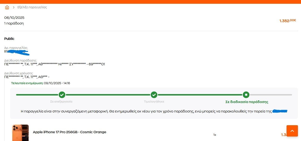 Th0d0ris21 Δημοσ. Παρασκευή στις 02:18 πμ Δημοσ. Παρασκευή στις 02:18 πμ Καλησπέρα στην ομάδα. Ακόμα στην αναμονή για την παραγγελία που έχω κάνει από 10/9 για 17 pm silver 256 από κοτσοβολο. Την Δευτέρα πήγα στο κατάστημα που έχω ζητήσει να το παραλάβω για να βρω μια γνωστή μήπως μπορεί να δει κάτι στο σύστημα μου λέει υπάρχει σημείωση για να έρθει 7 του μήνα αύριο . Πάω στις 7 μου λέει δεν ήρθε και της έβγαζε νέα ημερομηνία για 9 . Ωστόσο 2 μέρες τώρα στην εξέλιξη παραγγελίας μου έδειχνε αναμονή αποθέματος και σήμερα άλλαξε και έβγαζε το γνωστό αναμένουμε την παραγγελία από τις αποθήκες μας κλπ ενώ το αναμονή αποθέματος είχε Εξαφανιστεί οπότε λέω ωραία καλό σημάδι. Τελικά ούτε στην σημερινή παραλαβή του καταστήματος ήρθε και της έβγαζε νέα ημερομηνία 13/10. Το κατάστημα του Ηρακλείου παραλαμβάνει Τρίτη- πέμπτη- Σάββατο οπότε την Δευτέρα που έχει 13 είναι ήδη αδύνατο να έρθει πιστεύω.