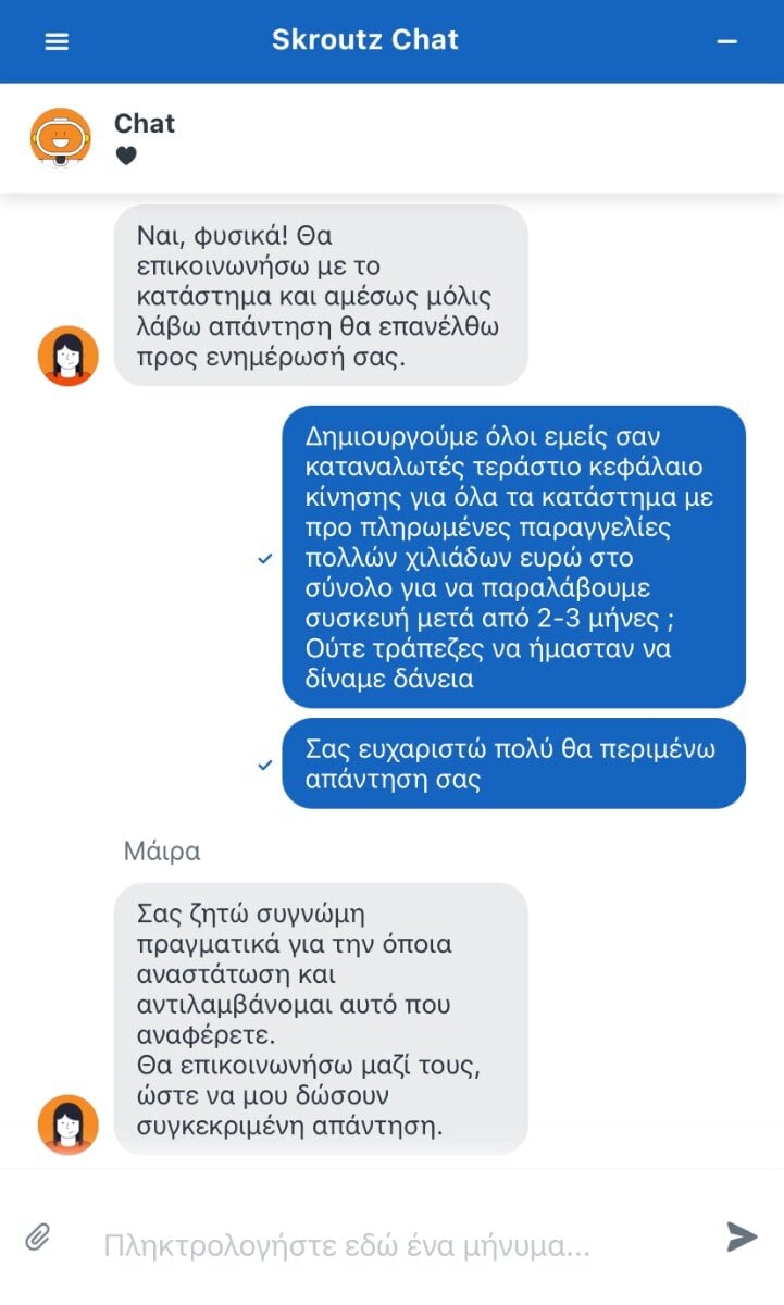 NoMans Δημοσ. 14 Οκτωβρίου Δημοσ. 14 Οκτωβρίου Πού να δείτε στο τσατ μποτ του Κώτσου που μου λέει ότι έχω κάνει λάθος τον αριθμό του κινητού ή της παραγγελίας.. Το θέμα είναι ότι ενώ είχα πει δε βιάζομαι, αρχίζει και κουράζει αρκετά η φάση και μάλλον θα παίξει ακύρωση. Άντε να περιμένω το πολύ μέχρι τέλος του μήνα. (Το μόνο "παρήγορο" σε σχέση με τις ελληνικές αλυσίδες είναι ότι και το Amazon έχει καθυστερήσεις και καμία διαθεσιμότητα σε Max).