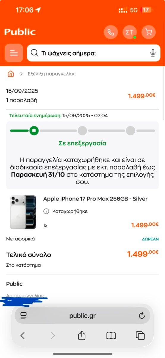 Antonisgb Δημοσ. 26 Σεπτεμβρίου Δημοσ. 26 Σεπτεμβρίου Εχω παραγγειλει το iphone 17 256gb black απο το you.gr απο τις 20/9 χωρις καμια ενημερωση και το προιον να βρισκεται σε κατασταση αναμενεται. Εχει κανεις ιδεα ποτε να το υπολογιζω;