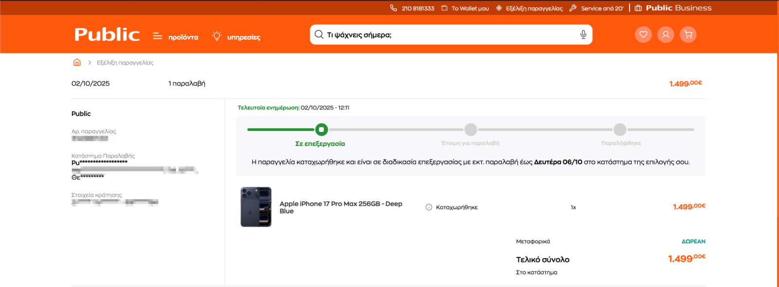 ktsak Δημοσ. 3 Οκτωβρίου Δημοσ. 3 Οκτωβρίου (επεξεργασμένο) 10 λεπτά πριν, newtron είπε Λοιπόν παιδιά, το Public έβγαλε για λίγο διαθέσιμο 17 PM 256 Μπλε με παράδοση Δευτέρα. Λόγω τιμολογίου δόσεων κλπ πήρα τηλ και όταν έκανα την παραγγελία και ρώτησα και στο τηλέφωνο μου είπαν ότι όντως για Δευτέρα 06/10 είναι η παράδοση σε κατάστημα κιόλας, παρότι στην εξέλιξη παραγγελίας λέει έως 08/11. Έκανα και την πληρωμή και περιμένω Δευτέρα να παραλάβω (ελπίζω). Να ξέρετε ότι έχουν ξεκάθαρη προτεραιότητα (μου το είπε η μια κοπέλα) αυτοί οι οποίοι προπληρώνουν και το ίδιο ισχύει και για το Πλαίσιο το οποίο το έμαθα χθες από άτομο που δούλευε παλιά στο Πλαίσιο στον τομέα κινητής συγκεκριμένα και διαχειριζόταν τέτοια κάθε χρόνο. Επίσης να ξέρετε ότι παίρνουν πρώτα και οι ίδιοι και μετά δίνουν έξω. Έκανα και 'γώ για ΡΜ 256 μπλε, χωρίς προπληρωμή, στην εξέλιξη παραγγελιας συνεχίζει να λέει από χθες "Η παραγγελία καταχωρήθηκε και είναι σε διαδικασία επεξεργασίας με εκτ. παραλαβή έως Δευτέρα 06/10 στο κατάστημα της επιλογής σου." Τι να πει κανείς ? Επεξ/σία 3 Οκτωβρίου από ktsak