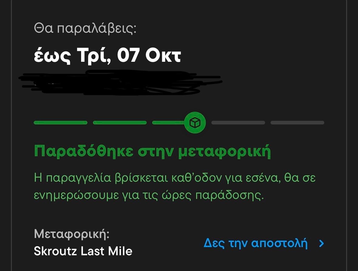 V_Sales Δημοσ. 4 Οκτωβρίου Δημοσ. 4 Οκτωβρίου 52 λεπτά πριν, V_Sales είπε Προπαραγγελία iPhone 17 Pro Deep Blue 256GB από isystem μέσω skroutz στις 17.09. Χθες μεσημέρι μου ήρθε ειδοποίηση ότι παραδόθηκε στο courier… Το μόνο καλό στην αναμονή του κινητού είναι το ανέλπιστο αυτό notification στο Apple Watch ότι θα παραλάβεις από Δευτέρα! Και μέσα στην αναμονή να βλέπεις και το incompetence του skroutz last mile για άλλη μια φορά…