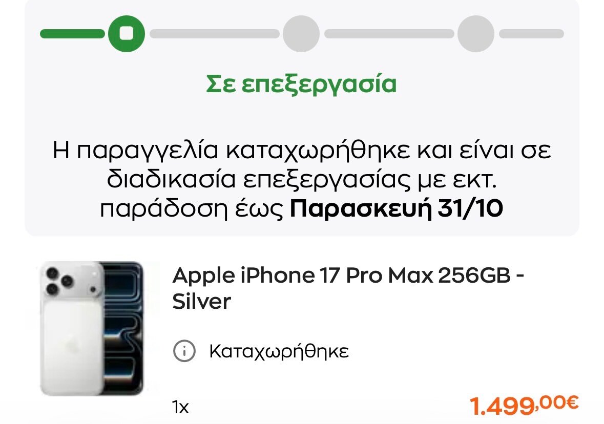smas_h Δημοσ. 6 Οκτωβρίου Δημοσ. 6 Οκτωβρίου 25 λεπτά πριν, bill_2 είπε ερωτηση , βγαζει ο Κωτσόβολος διαθεσιμα π.χ pm 256 , προχωραει η διαδικασία και σου λεει πληρωμη , πληρώνεις κανονικα , μετα το παραλαμβάνεις το κινητο την αλλη μερα η σε 2 ? η σου λενε οχι δεν υπαρχει αποθεμα ,το λεω αυτο γιατι βγαζει κατα καιρους στο σαιτ διαθεσιμα κοματια ! απλα δεν βλεπω εδω μεσα να περνει καποιος η δεν το καταλαβα? Αν δεις διαθέσιμο σε κατάστημα που μπορείς να πας, προχωράς κανονικά την παραγγελια με παραλαβή και πληρωμή στο κατάστημα(μην κανείς πληρωμή online). Μετά αν όντως είναι διαθέσιμη η συσκευή σου έρχεται μήνυμα ότι η συσκευή είναι διαθέσιμη για παραλαβή στο καταστημα και έχεις περιθώριο 3 ημέρες να την παραλαβεις. Το έκανα την προηγούμενη Τρίτη με 17 Pro 256 Silver που εμφανιστηκε διαθεσιμο στο Mall. 1