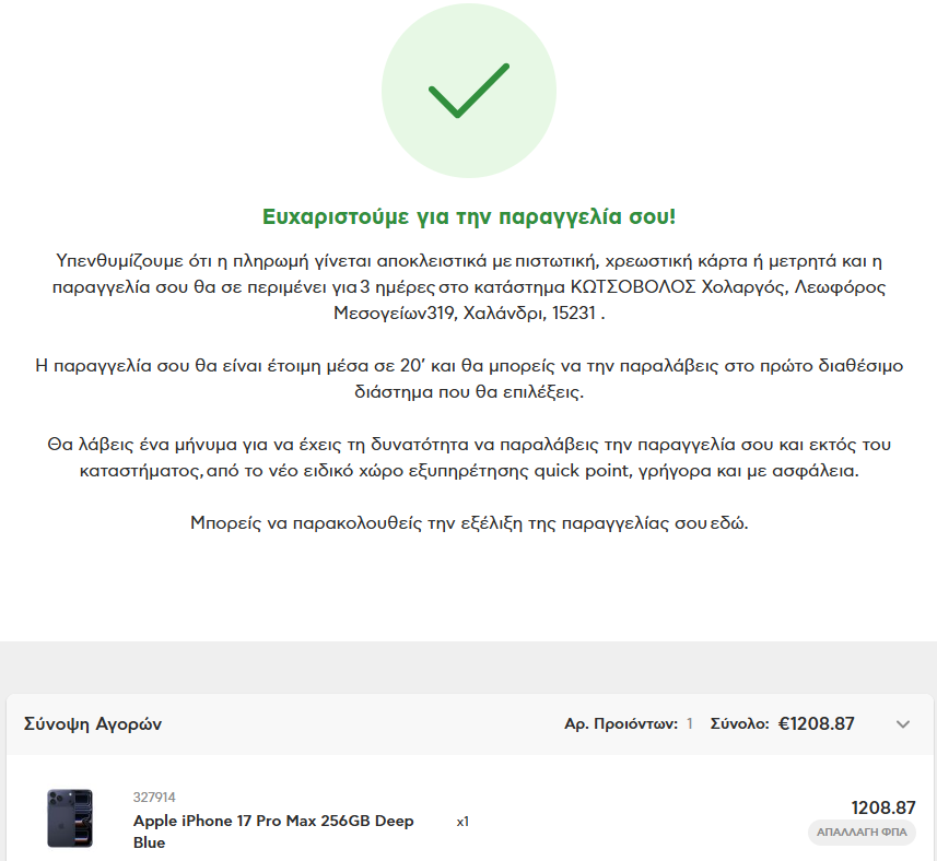 Makka Δημοσ. Τρίτη στις 05:05 μμ Δημοσ. Τρίτη στις 05:05 μμ 1 ώρα πριν, Makka είπε Βρηκα διαθεσιμο 17PM deep blue 256 καλαμαρια και το εβαλα παραγγελια με παραλαβη και πληρωμη απο καταστημα Κωτσοβολου, μεχρι στιγημς ειναι σε εκκρεμοτητα. Τα καταφερα και εγω 07/10/2025 15:12 παραγγελια , μολις παρελαβα. 2
