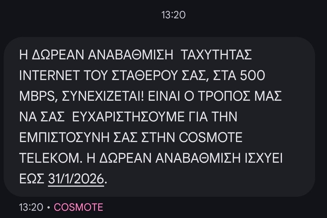 jazzu4ia Δημοσ. Παρασκευή στις 08:45 μμ Δημοσ. Παρασκευή στις 08:45 μμ (επεξεργασμένο) 9 hours ago, Thresh said: Δεν εξαιρεί, αλλά όταν μιλάει για 500.000 συνδρομητές δεν εννοεί τους πάντες μιας και το πελατολόγιό της στη σταθερή ξεπερνάει το 1 εκατ... ...όχι, μιλάει γιά ΠΑΝΩ ΑΠΟ μισό εκατομμύριο συνδρομητές... ...""προσφέρουμε τη δυνατότητα σε πάνω από 500 χιλιάδες συνδρομητές μας"" ... ...υπάρχουν πάρα πολλοί όπου δέν γίνεται...όπως στό άλλο μου VDSL όπου δέν μπορούν νά μέ πάνε στά 200 , αφού δέν έχει αναβαθμιστεί ή καμπίνα σέ 35b... ...anyway, εγώ δέν μίλησα καθόλου μαζί τους ούτε εκδήλωσα τάσεις φυγής οπότε δέν ισχύει ότι ανησυχήσανε...άλλωστε τό βρήκα κι εγώ όπως οί άλλοι μέσα στήν εφαρμογή, όπως περιγράφεται ακριβώς στήν ανακοίνωση, οπότε όλα δείχνουν ότι ισχύει καί γιά τό VDSL αλλά καί γιά τό ADSL γιά τίς περιπτώσεις όπου είναι τεχνικά εφικτό... On 25/09/2025 at 12:29, George! said: Όσοι έχουμε ακόμα double play με 24άρα ταχύτητα θα πάρουμε αύξηση ταχύτητας; ...πολύ πιθανό άν είναι τεχνικά εφικτό... Επεξ/σία Παρασκευή στις 08:51 μμ από jazzu4ia ...τό ξαναλέω γιά νά τό εμπεδώσεις...