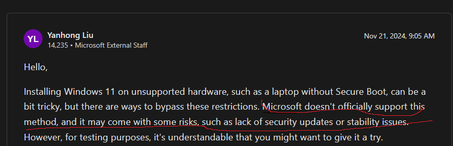 Vault13 Δημοσ. Δευτέρα στις 06:41 μμ Μέλος Δημοσ. Δευτέρα στις 06:41 μμ 4 ώρες πριν, benign είπε Απο intel 8ης γενιας και μετα υπαρχει υποστηριξη παντως σε windows 11. Οσο για τα workarounds να ειστε σιγουροι οτι θα ειναι προσωρινα. Προσωπικα αν ειχα εταιρια και δεν χρειαζομουν καποιο ειδικο προγραμμα που να τρεχει μονο Windows, θα εβαζα Linux και ειτε Fedora,ειτε Ubuntu. Μαλλον το δευτερο για εταιρια . Η ίδια η microsoft δινει οδηγίες για bypass…? https://learn.microsoft.com/en-us/answers/questions/2121461/install-windows-11-without-secure-boot-on-an-unsup