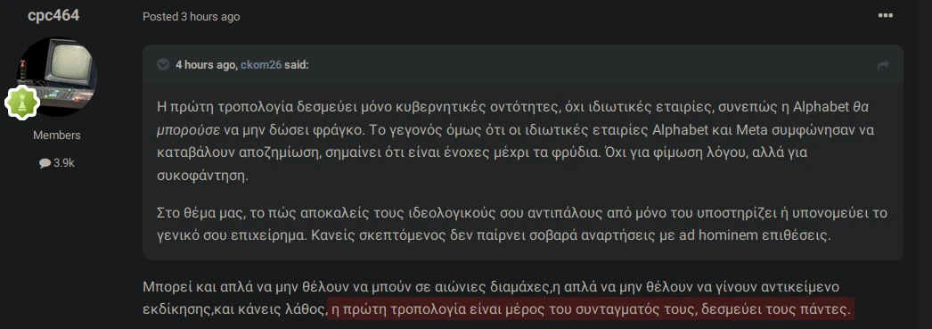 kata_tixi Δημοσ. πριν από 1 ώρα Δημοσ. πριν από 1 ώρα 4 ώρες πριν, Dr_Pepper είπε Δεν πεινάει κανείς στην χώρα του και οι άστεγοι είναι κυρίως απο επιλογή έτσι (πχ την έχουν δει χίπηδες ή θέλουν οπωσδήποτε να ειναι Καλιφόρνια και ας μην μπορούν να νοικιάσουν παρά σε επαρχιακή πόλη κτλ ) ή λόγω προβλήματος πχ εξάρτησης ναρκωτικών ή άλλων ψυχολογικών προβλημάτων. Δεν είναι σπάνιο να τους δεις με κινητά και λαπτοπ Μέτα όσοι ειναι ένα βήμα πάνω απο αυτούς με subsidies για να μένουν κάπου foodstamps wellfare κτλ ζούνε καλύτερα απο τους ιδιωτικούς υπαλλήλους με βασικό μισθό στην ελλάδα. ζεις εκει φιλε; εχις παει ποτε και γνωριζεις; ή επειδη το λεει ο trump ετσι θα ειναι; 3 ώρες πριν, ckom26 είπε Η πρώτη τροπολογία δεσμεύει μόνο κυβερνητικές οντότητες, όχι ιδιωτικές εταιρίες, συνεπώς η Alphabet θα μπορούσε να μην δώσει φράγκο. Το γεγονός όμως ότι οι ιδιωτικές εταιρίες Alphabet και Meta συμφώνησαν να καταβάλουν αποζημίωση, σημαίνει ότι είναι ένοχες μέχρι τα φρύδια. Όχι για φίμωση λόγου, αλλά για συκοφάντηση. Στο θέμα μας, το πώς αποκαλείς τους ιδεολογικούς σου αντιπάλους από μόνο του υποστηρίζει ή υπονομεύει το γενικό σου επιχείρημα. Κανείς σκεπτόμενος δεν παίρνει σοβαρά αναρτήσεις με ad hominem επιθέσεις. δεν ειναι πολιτικος αντιπαλος ο trump. δεν παραγει πολιτικη ο trump. μην τρελενεσαι.