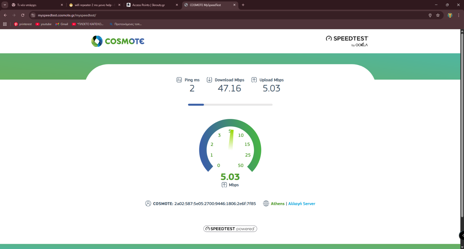 micos000 Δημοσ. Πέμπτη στις 01:16 πμ Δημοσ. Πέμπτη στις 01:16 πμ Κάτσε γιατί κάπου το χάσαμε. 2ms (2 milliseconds) είναι ping και το θέλουμε όσο το δυνατό χαμηλότερο. Το download το μετράμε σε Kbps ή Mbps ή MB/s