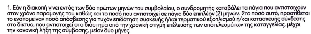 NIKOLETAL Δημοσ. Κυριακή στις 10:39 πμ Μέλος Δημοσ. Κυριακή στις 10:39 πμ 10 ώρες πριν, christakos07 είπε Αναφερόμουν σε αυτά που διάβασες στο insomnia. Εφόσον έχεις μπροστά σου το συμβόλαιο μπορείς εύκολα να κατανοήσεις ότι δεν υπάρχει υπαναχώρηση χωρίς πρόστιμο εφόσον ενεργοποιηθείς στον νέο πάροχο είτε αυτό είναι αποτέλεσμα της άμεσης ενεργοποίησης είτε μετά το πέρας των 14 ημερών. Άρχισε να κατανοείς καλύτερα αυτά που διαβάζεις ή τουλάχιστον εφόσον δεν τα κατανοείς μην βγάζεις τουλάχιστον συμπεράσματα. Πλήρωσε το πρόστιμο προς το παρόν. Δύο πάγια θα πληρώσει αφού στο συμβόλαιο υπάρχει παρόμοιος προς με αυτόν: Α ναι...για το insomnia οκ λάθος θυμάμαι.Κατι σχετικό είχα διαβάσει ότι δεν ισχύει ρήτρα αλλά δεν θυμάμαι τι ακριβώς αφορούσε κ μάλλον μπερδευομαι...